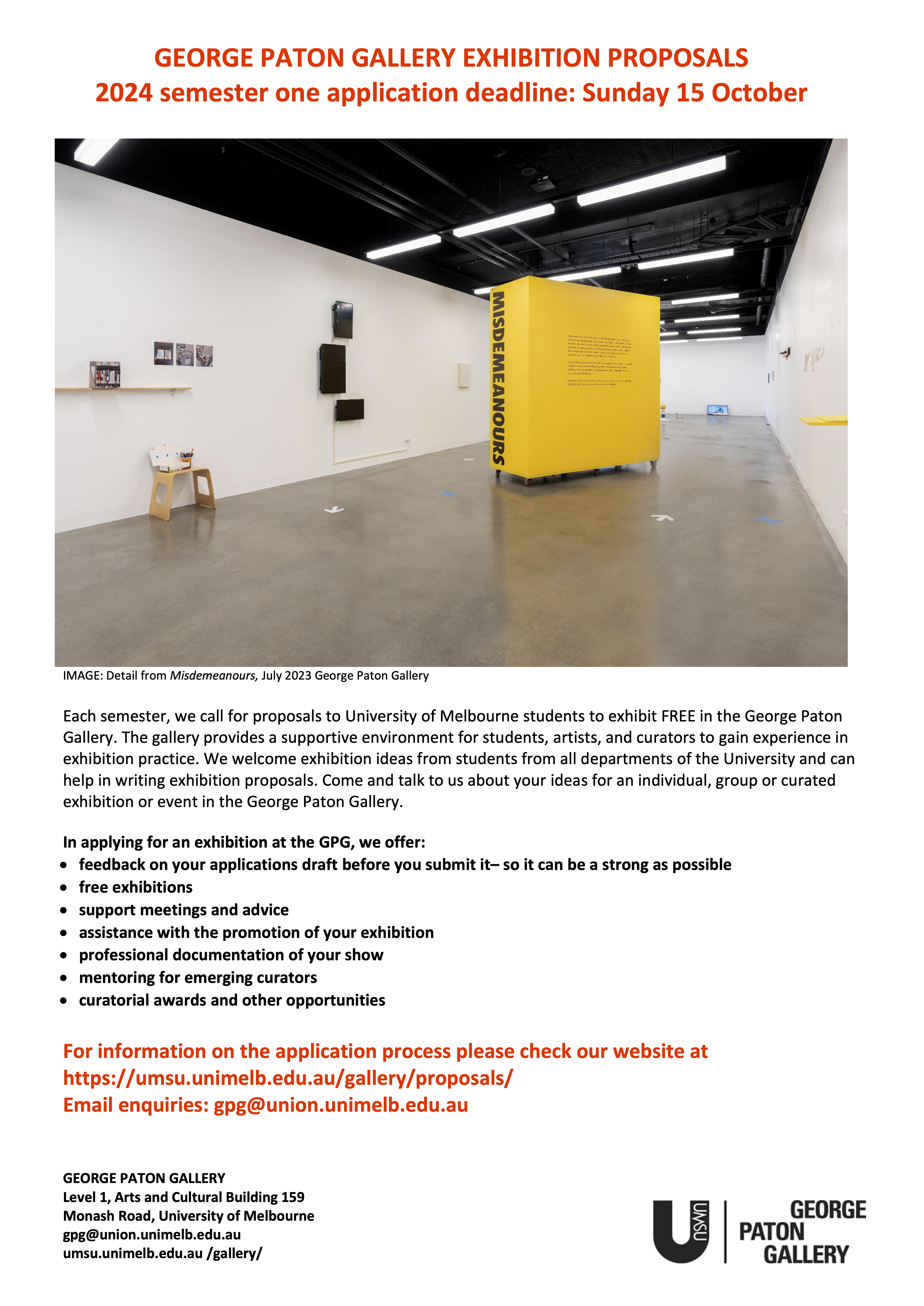 Each year we inviting proposals from current University of Melbourne students for the George Paton Gallery exhibition program. Applications are open to all students, from any discipline or level of experience.